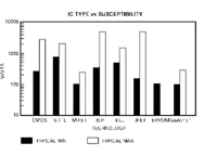 例如,典型情況下,一個人所帶電荷可以表征為一個150pF的電容器與330Ω的電阻器串聯(lián)。推算其靜電電壓有可能在8~15kV范圍內(nèi),甚至高達(dá)25kV。當(dāng)人接近系統(tǒng)時,靜電場(ESD)和不均勻電壓分布會導(dǎo)致系統(tǒng)內(nèi)元件被損壞。一般來說,ESD很容易損壞未受保護的IC。據(jù)統(tǒng)計,各類IC的ESD擊穿電壓分布如圖1所示。