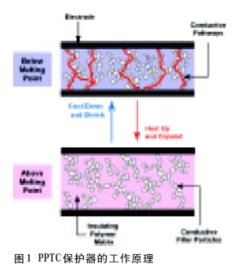 保護(hù)繼電器的一個常用元件是高分子聚合物正溫度系數(shù)(PPTC)自復(fù)過流保護(hù)器(見圖1)。 它是用碳黑這種導(dǎo)電性填料做成的。在這個元件中碳黑構(gòu)成網(wǎng)狀導(dǎo)電通路。在正常的情況下,PPTC保護(hù)器呈現(xiàn)低電阻,但是,在PPTC保護(hù)器中流過的電流過大時,它的溫度升高,結(jié)晶狀聚合物變成非結(jié)晶狀態(tài)。這個轉(zhuǎn)變引起聚合物膨脹,使得導(dǎo)電性聚合物內(nèi)的網(wǎng)狀導(dǎo)電通路斷開。這個變化引起它的電阻急劇上升。由于電阻增大,于是保護(hù)器中流過的電流便下降到很小。PPTC保護(hù)器保持這個狀態(tài),直到故障被排除。一旦把故障排除了,保護(hù)器的溫度下降,碳黑形成的導(dǎo)電通路恢復(fù),它又回到低電阻狀態(tài)??梢圆皇褂肞PTC 保護(hù)器而用傳統(tǒng)的熔斷器來保護(hù)繼電器。不過,在使用熔斷器的情況下,每當(dāng)發(fā)生故障,就需要更換熔斷器。PPTC保護(hù)器的主要優(yōu)點(diǎn)在于它具有自復(fù)功能,從而可以減少昂貴的服務(wù)費(fèi)用和保修費(fèi)用。