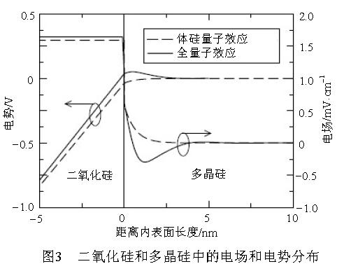 ,二氧化硅厚度為5 nm。可以看到考慮多晶硅量子效應時氧化層電場比不考慮多晶硅量子效應時大,這是由于偶極子的產(chǎn)生使電場發(fā)生扭曲,增加了氧化層中的電場,使得在體硅中的載流子增加,也就意味著多晶硅量子效應會導致閾值電壓的減小。