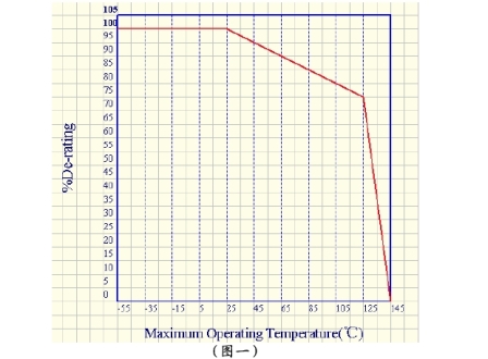 1. 溫度折減率: 當熔斷器工作的環(huán)境溫度高于25℃時必須考慮溫度的影響,在選擇熔斷器額定值時可依據(jù):額定電流=工作電流/0.75/溫度折減率。 例如:如果工作溫度為65℃,從AEM溫度折減曲線可查出折減系數(shù)為90%,如果工作電流為4A,則我們應(yīng)該選用的熔斷器額定值為:4/0.75/90%=5.9A或6A。