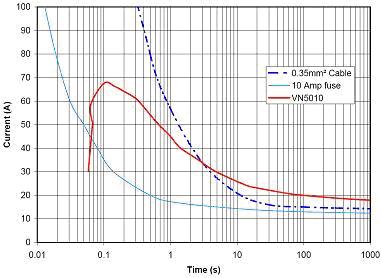在圖5的示例中有一個點,智能開關(guān) (VN5010)將繼續(xù)前行,而電線將開始自毀(紅線在藍色虛線上方)。如果這種情況是真實的,甚至連電路板都可能會自毀?,F(xiàn)在考慮到涌流要求很可能更加嚴格,我們開始意識到有必要開發(fā)一個能夠仿真熔斷器特性的保護算法。