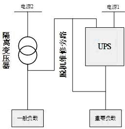 如圖一所示,這個是石化行業(yè)典型的兩電源的UPS構架,由兩路電源,一個隔離變壓器、一臺UPS組成。UPS采用雙電源回路輸入,UPS主電源由電源1提供,UPS旁路電源有電源2提供,同時UPS設置一個脫機維修旁路,允許UPS在故障維修或者更換時,系統(tǒng)仍然能夠正常工作。同時DCS系統(tǒng)中的負載分為兩個級別,即一般負載和重要負載,重要負載(一級負荷)由UPS系統(tǒng)直接供電,一般負載(三級負荷)由電源2經(jīng)隔離變壓器后供電。