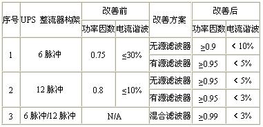 因此,在選擇UPS的同時,必需考慮相應的功率因數(shù)及諧波改善措施。目前的主流的UPS的改善主要包括移相、無源濾波器、有源濾波器、混合式濾波幾種方案。其中移相是指在6脈沖整流器基礎上,增加一個移相變壓器后再增加一個6脈沖整流器,可以抑制諧波。機種諧波改善情況如下表所示:
