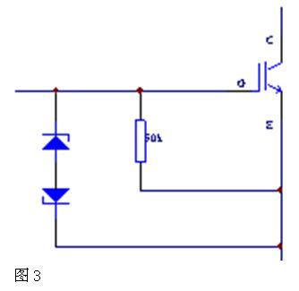 這時若集電極和發(fā)射極處于高壓狀態(tài)時,會使IGBT發(fā)熱,極易引起IGBT損壞。為防止此類情況發(fā)生,可在IGBT的柵極與發(fā)射極間并接一只50~100歐姆的電阻,此電阻應(yīng)盡量靠近柵極與發(fā)身極。如圖3所示。