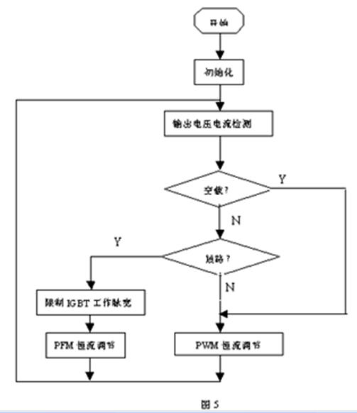 同時為保證輸出電流恒定,單片機(jī)在判斷輸出為短路時將逆變器的等脈沖寬度調(diào)節(jié)(PWM)變?yōu)轭l率調(diào)節(jié)控制(PFM),即脈沖分頻控制,輸出電壓越低,輸出脈沖的頻率越低。其單片機(jī)程序過程如圖5所示: