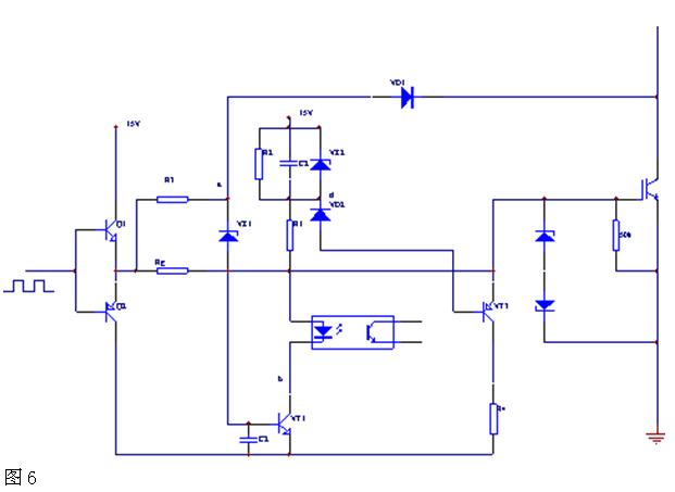 應(yīng)設(shè)計保護(hù)電路為立即保護(hù)型。即保護(hù)電路動作后,切斷供電電源,停止逆變電源工作;最后,對元器件并沒有失效,而是由于某種其它原因如負(fù)載突然加大造成的過流,可嘗試采用一種慢降柵壓的電路來實現(xiàn)如圖6: