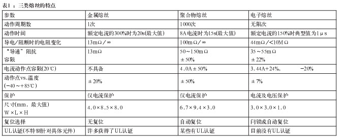 聚合物器件以導電型塑料制成,這些器件在電流(內部熱量)達到預設定的電平時會改變它們的阻抗。這些器件也經常與TVS器件一起使用,就像金屬熔絲那樣。電子熔絲是半導體電路,控制功率開關(通常是功率MOSFET),并按照預設的參數(shù)改變其阻抗。表1簡單比較了這三類熔絲。