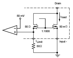 電子熔絲使用SENSEFETTM來開關電源、限制電流及監(jiān)測輸出電流。SENSEFET的優(yōu)勢是僅測量小部分的負載電流。沒有SENSEFET,全部負載電流將要流經感測電阻,而這將需要大功率、極低阻抗的電阻。與價格不足1美分的小型片式電阻相比,這些電阻較昂貴。