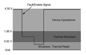 圖5顯示的是這電路的信號電平,而圖6顯示的是等效原理圖。在正常工作中,內部電流源將啟用引腳上拉至4.3V。如果發(fā)生熱故障,由于過大直流電流、限流或過壓保護原因,這器件將關閉,熱邏輯將把這信號下拉至1.6V電平。