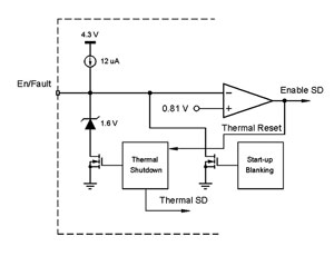 啟用電路使用戶能夠控制器件,并在發(fā)生熱關閉時提供信號。這是一種三態(tài)信號,同時發(fā)送及接收信息,能夠監(jiān)測這信號以檢測芯片的狀態(tài)。如果用戶選擇不用這個引腳,它只需保留在開路狀態(tài),器件會自己控制。