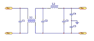 為了抑制外來的高頻干擾,也為了抑制DC/DC變換器對外傳導干擾,通過在DC/DC變換器的輸入端、輸出端設計濾波電路,抑制共模、差模干擾,降低EMI電平。其中,C1、C2、C3為差模濾波電容,C4、C5為共模濾波電容,L1為共模扼流圈,L2為差模濾波電感。