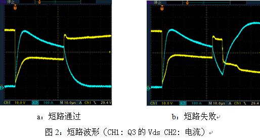 當控制器工作時,如電機短路,則會形成如圖1中所示的流經(jīng)Q2,Q3的短路電流,其電流值很大,達幾百安培,MOSFET的瞬態(tài)溫升很大,這種情況下應及時保護,否則會使MOSFET結(jié)點溫度過高而使MOSFET損壞。短路時Q3電壓和電流波形如圖2所示。圖2a中的MOSFET能承受45us的大電流短路,而圖2b中的MOSFET不能承受45us的大電流短路,當脈沖45us關(guān)斷后,Vds回升,由于溫度過高,僅經(jīng)過10us的時間MOSFET便短路,Vds迅速下降,短路電流迅速上升。由圖2我們可以看出短路時峰值電流達500A,這是由于短路時MOSFET直接將電源正負極短路,回路阻抗是導線,PCB走線及MOSFET的Rds(on)之和,其數(shù)值很小,一般為幾十毫歐至幾百毫歐。