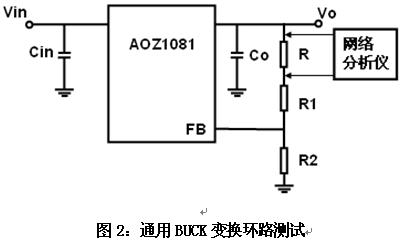 對于通用BUCK降壓型變換器,可以直接在反饋分壓電阻器上部電阻中,直接串接一個(gè)100歐姆的電阻R,由R注入測試信號,測量增益裕量和相位裕量,用于決定的系統(tǒng)的穩(wěn)定程度,如圖2所示。注意到,相對于輸出的負(fù)載電阻,此回路相當(dāng)于一個(gè)高阻抗回路,因此不影響系統(tǒng)的正常工作。
