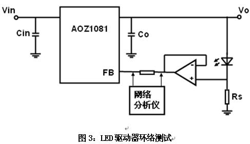 這樣,就必須引入一種隔離的電路,使注入的信號不影響電源系統(tǒng)的正常工作。通常,電壓跟隨器具有阻抗變化,也就是其輸入相當(dāng)于開路,輸出相當(dāng)于短路,同時(shí),時(shí)還具有緩沖的作用,也就是在信號源和負(fù)載之間緩沖,將輸入信號無損耗的輸出。因此,可以使用圖3的電路測量LED驅(qū)動(dòng)器的環(huán)路穩(wěn)定性。