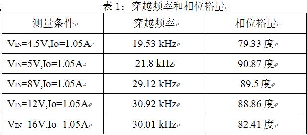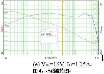 基于AOZ1081設(shè)計(jì)LED驅(qū)動(dòng)器,輸入電壓4.5 V到16 V,輸出為一個(gè)HB LED,;使用Venable的3120測量環(huán)路,Rc=61.9kohm,Cc=820pF,測量波形和結(jié)果如圖4和表1所示。