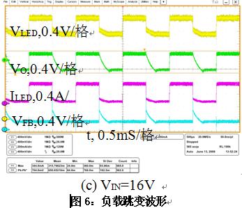 可以用圖5的負(fù)載跳變來驗(yàn)證系統(tǒng)的穩(wěn)定性,MOS驅(qū)動(dòng)信號的頻率為1kHz,負(fù)載電流從35mA到350mA跳變,波形如圖6所示