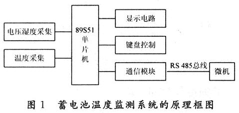 蓄電池溫度監(jiān)測系統(tǒng)的原理框圖如圖1所示。主要由電壓、溫濕度采集、溫度采集、89S51單片機、鍵盤控制模塊、顯示電路模塊、通信模塊組成。該系統(tǒng)能完成6組或6組以上通信電池的溫度測量、1路機房環(huán)境測量(溫度、濕度測量)、2路直流電壓和2路交流電壓測量,傳輸數(shù)據(jù)距離大于200m。