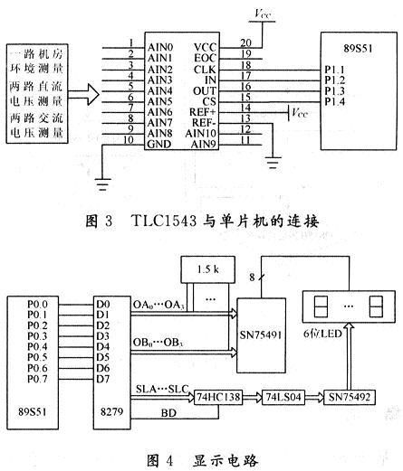 直流電壓、交流電壓以及機房溫濕度的測量選用TLC1543,TLC1543為10位11通道的A/D轉換器,與單片機的連接如圖3所示。機房環(huán)境測量(溫度、濕度)采用JWS溫濕度變送器,輸出信號為標準0~5V直流電壓信號;直流電壓的數(shù)據(jù)采集經(jīng)電阻分壓后直接送至A/D轉換器,交流電壓的采集經(jīng)分壓整流后也直接送至A/D轉換器。