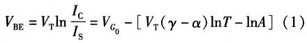 式中VG為帶隙電壓,γ和α為器件參數(shù),A代表了那些方程推到過程中與溫度無關(guān)的常量。因?yàn)閂t=kt/q,可以得到VBE隨溫度上升是降低的。其關(guān)于溫度變化的方程為