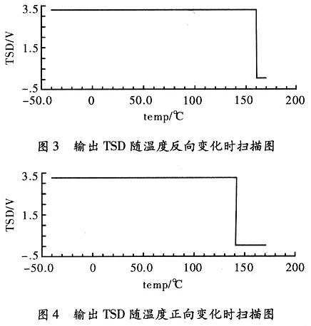 按照以上設(shè)計的電路。用Cadence Specture對其進(jìn)行仿真,器件的模型參數(shù)采用0.35μm CMOS工藝。圖2為過溫保護(hù)電路的輸出控制信號TSD,隨溫度上升和下降的曲線。電源電壓取3.3 V。從仿真結(jié)果可以看出,該電路實(shí)現(xiàn)了良好的“溫度遲滯”特性。遲滯功能有效的避免了芯片出現(xiàn)熱振蕩問題。關(guān)斷溫度TH160°和恢復(fù)溫度TL140°。