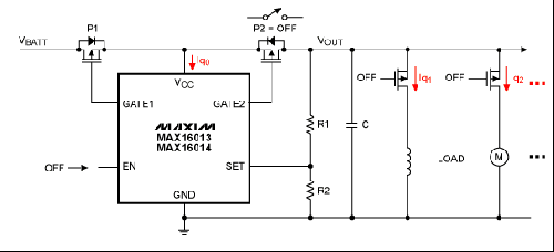 圖9.MAX16013/MAX16014用作主開關(guān)控制,在ECU關(guān)閉時有助于降低靜態(tài)電流損耗。