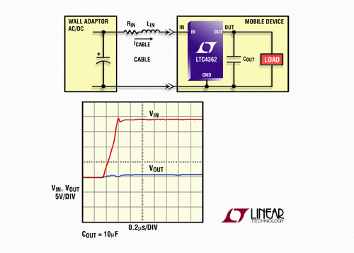 凌力爾特公司 (Linear Technology Corporation) 推出 2.5V 至 5.5V 過壓和過流保護器 LTC4362,該器件為保護低壓、便攜式電子產(chǎn)品免受電壓瞬態(tài)和電流浪涌的損害而設(shè)計。電源適配器失效或故障,或者將一個 AC 適配器帶電插入設(shè)備的電源輸入時,可能會發(fā)生過壓。無意間將錯誤的電源適配器插入設(shè)備可能會因過壓或負電源電壓而引起損壞。LTC4362 運用準確度為 2% 的 5.8V 過壓門限檢測過壓事件,并在 1us (最大值) 時間內(nèi)快速響應(yīng),以隔離下游組件和輸入。高達 28V 的過壓保護由一個內(nèi)部雪崩額定的低 RDS(ON) MOSFET 實現(xiàn),而且在大多數(shù)應(yīng)用中無需瞬態(tài)電壓抑制器 (TVS) 或其它外部組件,就可承受電感電纜瞬態(tài)。此外,LTC4362 監(jiān)視一個內(nèi)部電流檢測電阻器兩端的壓降,以提供準確度為 20% 的 1.5A 過流門限。LTC4362 目標是具有多個電源選項的便攜式電子產(chǎn)品,如通過交流和汽車電池適配器以及USB端口充電的蜂窩電話、MP3/MP4 播放器、數(shù)碼相機等。