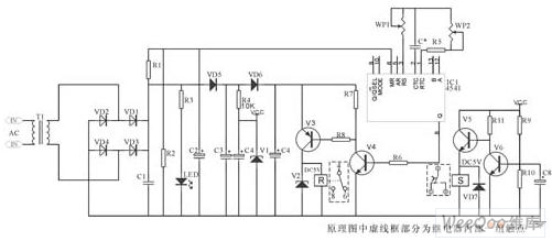 該電路核心部分由IC4541構(gòu)成,延時(shí)設(shè)定由RP2、C*設(shè)定,A-B端根據(jù)需求接相應(yīng)高、低電平(設(shè)定端)內(nèi)部2繞組閉鎖繼電器采用DC12V(因繼電器工作電壓與IC4060組成延時(shí)電器要低,則為保證其驅(qū)動(dòng)則分別由V6、V7、V1、V3構(gòu)成)。其中C2為二次儲(chǔ)能器件,可根據(jù)延時(shí)的長(zhǎng)短予以調(diào)整,C4為完成S置位線圈工作。