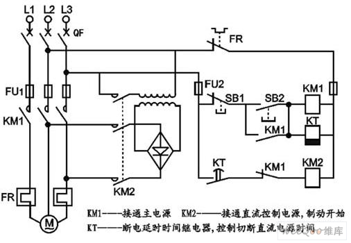 制動(dòng)過程:按下停止按鈕SB1→KM1斷電,KM1主觸點(diǎn)斷開,電機(jī)脫離電源,KM1輔助常閉觸點(diǎn)恢復(fù)閉合,KM2通電,接入直流電源,制動(dòng)開始,同時(shí)KM1輔助常開觸點(diǎn)又恢復(fù)斷開,則KT線圈呈斷電狀態(tài),延時(shí)開始,待所設(shè)延時(shí)時(shí)間到達(dá)后,KT的延時(shí)斷開常開觸點(diǎn)恢復(fù)斷開,KM2失電,切斷直流電源,制動(dòng)結(jié)束。