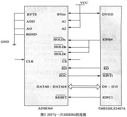 TMS320LF4207A本身雖然自帶A/D轉(zhuǎn)換器,但其轉(zhuǎn)換精度只有10位,且轉(zhuǎn)換速度也不高(500ns)。為了實(shí)現(xiàn)更高的速度和精度,選擇了擴(kuò)展ADS8364芯片。ADS8364是一種高速、低功耗、雙16bA/D轉(zhuǎn)換器,有6個模擬量輸入通道??捎肂VDD獨(dú)立供電。它有6個完全相同的采樣保持電路,分成A、B、C3組,每一組都由1個HOLD引腳控制。ADS8364可以從外部引入最大5MHz的時鐘頻率,此時采樣時間是0.8μs,轉(zhuǎn)換時間只有3.2μs,A/D的最大采樣率達(dá)到250K,要達(dá)到此值,可在下一次轉(zhuǎn)換開始時讀取上一次的轉(zhuǎn)換結(jié)果。此A/D完全可以滿足本裝置的采樣要求。AD芯片與DSP的連接如圖3所示。
