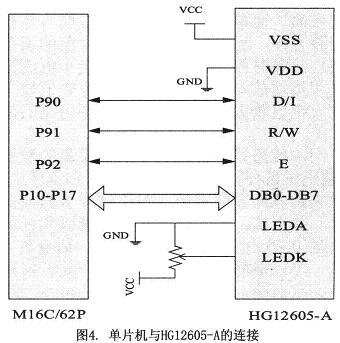 HG12605-A中內(nèi)藏ST7920點(diǎn)陣式LCD控制與驅(qū)動芯片,可以顯示字母、數(shù)字符號、漢字、以及自定義文字符號。ST7920芯片內(nèi)部集RAM和ROM、字型產(chǎn)生器、以及液晶驅(qū)動器和控制電路于一體,因此,只要一個很小的處理系統(tǒng),就可以操作HG12605-A液晶顯示模塊,并且硬件連接簡單。液晶模塊和單片機(jī)的連接如圖4所示。