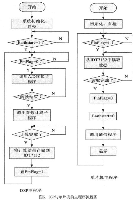 FinFlag為計算完成標(biāo)志。外部輸入的電壓、電流信號經(jīng)過輸入轉(zhuǎn)換電路變?yōu)榈蛪盒⌒盘?,?jīng)過平移電路和信號調(diào)理,成為可以直接被A/D轉(zhuǎn)換的采樣信號,輸入A/D轉(zhuǎn)換器。DSP芯片從A/D的寄存器中讀取數(shù)據(jù)。當(dāng)所有的轉(zhuǎn)換都結(jié)束時,DSP啟動數(shù)據(jù)處理程序,即應(yīng)用小波分析對數(shù)據(jù)進(jìn)行分析和計算。計算完成后,將計算結(jié)果存儲在雙口RAM中,并把FinFlag標(biāo)志置1。當(dāng)單片機(jī)查詢到此標(biāo)志為真時,啟動數(shù)據(jù)讀取程序,從雙口RAM中讀取DSP已經(jīng)運(yùn)算完成的數(shù)據(jù)。當(dāng)讀取完成時,F(xiàn)inFlag和Earthstart標(biāo)志都置為0,然后完成顯示任務(wù)和串行通信任務(wù)。系統(tǒng)等待下一次接地故障的發(fā)生。