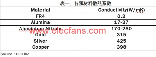 就LED芯片承載基板的發(fā)展上,以承載芯片而言,傳統(tǒng)PCB的基板材質(zhì)具有高度商業(yè)化的特色,在LED發(fā)展初期有著相當(dāng)?shù)挠绊懥?。然而,隨著LED功率的提升,LED基板的散熱能力,便成為其重要的材料特性之一,為此,陶瓷基板逐漸成為高效能LED的主要散熱基板材料(如表一所示),并逐漸被市場接受進(jìn)而廣泛使用。近年來,除了陶瓷基板本身的材料特性問題須考慮之外,對基板上金屬線路之線寬、線徑、金屬表面平整度與附著力之要求日增,使得以傳統(tǒng)厚膜工藝備制的陶瓷基板逐漸不敷使用,因而發(fā)展出了薄膜型陶瓷散熱基板,本文將針對陶瓷散熱基板在厚膜與薄膜工藝及其產(chǎn)品特性上的差異做出分析。