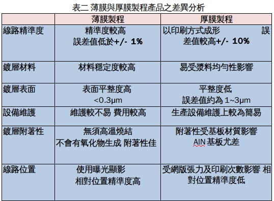 但從產(chǎn)品成本結(jié)構(gòu)來看,如表二所示薄膜產(chǎn)品的工藝設(shè)備(黃光微影)與生產(chǎn)環(huán)境(無塵或潔凈室)相較于厚膜產(chǎn)品其成本較高,然而薄膜工藝的金屬線路多以厚銅材料為主,相較于厚膜印刷之厚銀而言,材料成本卻相對較低,因此,可預(yù)期的當(dāng)利用薄膜工藝將陶瓷基板金屬化的產(chǎn)品,日漸達(dá)到經(jīng)濟(jì)規(guī)模時(shí),其成本將逐漸趨近于厚膜產(chǎn)品。