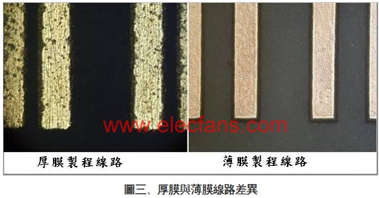 圖(三)即為璦司柏薄膜基板產(chǎn)品與傳統(tǒng)厚膜產(chǎn)品的金屬線路光學(xué)顯微圖像??擅黠@看出厚膜印刷之線路,其表面具有明顯的坑洞且線條的平整度不佳,反觀以薄膜工藝制備之金屬線路,不但色澤清晰且線條筆直平整。