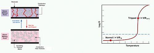 此時(shí)電阻可增加到原值的1000倍以上或更高倍數(shù)。電阻增加后,電路中的電流值減至可在故障情況下流動(dòng)的一個(gè)較低且穩(wěn)定的狀態(tài),因而保護(hù)了設(shè)備。在元件轉(zhuǎn)變?yōu)楦咦柚禒顟B(tài)下,可稱之為“已動(dòng)作”。元件將保持已動(dòng)作(高阻值)狀態(tài),直到故障清除并將設(shè)備的電源斷開(kāi),此時(shí),導(dǎo)電性聚合物冷卻下來(lái)并重新結(jié)晶,將PPTC元件恢復(fù)到較低阻狀態(tài)下,而受影響的設(shè)備也恢復(fù)到正常運(yùn)作狀態(tài)。