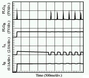 PowerSwitch電源開(kāi)關(guān)元件檢測(cè)到了通道A的故障,并開(kāi)始限制電流。而只有在通道A,PowerSwitch將真正地開(kāi)始ON/OFF循環(huán)週期直至故障現(xiàn)象消失。而通道B上的連續(xù)電流處于技術(shù)規(guī)范之內(nèi),其工作保持不受影響。