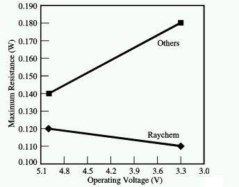 在USB的設(shè)計(jì)中,另一項(xiàng)重要的考慮因素是隨著電壓的下降,電阻值也會(huì)下降。隨著供電電壓的下降,電壓降問(wèn)題顯得更加突出。一般來(lái)說(shuō),電壓下降將導(dǎo)致電源開(kāi)關(guān)的導(dǎo)通電阻增加,這是一種不期望的特性。但Raychem的PowerSwitch元件的電阻卻能夠隨著供電電壓的下降而下降,因而避免這不利特性。如圖7所示,在匯流排電壓較高時(shí),PowerSwitch能夠減少輸出電流值,提升電源的效率和電池的使用壽命。在匯流排電壓較低時(shí),PowerSwitch兩端的電壓降也會(huì)降低,這樣USB功能就能繼續(xù)工作一段更長(zhǎng)的時(shí)間。