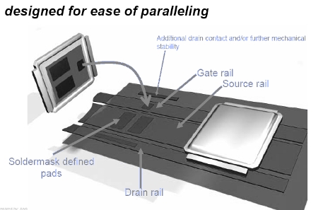 除了裸芯片,IR亦將提供專(zhuān)有的芯片載體解決方案。該方案附有正面金屬可焊IGBT,來(lái)支持那些生產(chǎn)線沒(méi)有能力處理裸芯片的客戶。最先進(jìn)的高性能IGBT是以非常纖薄的晶圓制造,厚度僅為60到70微米。這些硅晶圓既薄且具彈性,就如紙張一樣,所以必須使用極為專(zhuān)業(yè)的程序和昂貴的器材去處理。很多第一級(jí)和第二級(jí)的系統(tǒng)供應(yīng)商都不愿意投資這種昂貴的器材,也不想經(jīng)歷需要長(zhǎng)久學(xué)習(xí)才會(huì)熟練的纖薄芯片處理過(guò)程,更不希望要承受薄芯片處理期間非常高的良率耗損。