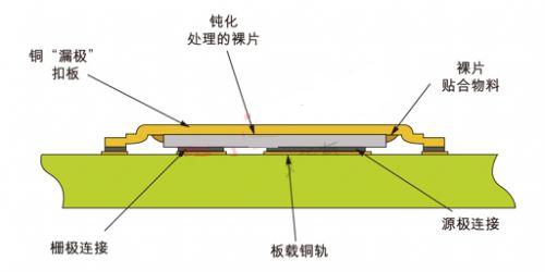 圖2:DirectFET的橫切面:硅芯片的溫度和電力接口盡量縮小尺寸,同時(shí)電力和溫度性能也遠(yuǎn)遠(yuǎn)超出采用鍵合線的標(biāo)準(zhǔn)封裝。