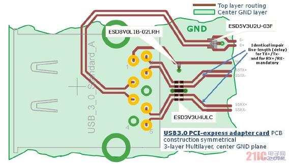 具備ESD防護(hù)電路的標(biāo)準(zhǔn)A連接器USB3.0布局布線設(shè)計(jì)建議圖5:具備ESD防護(hù)電路的標(biāo)準(zhǔn)A連接器USB3.0布局布線設(shè)計(jì)建議。USB3.0的新型ESD防護(hù)策略持續(xù)不斷地減小芯片的各個(gè)組件的尺寸是降低生產(chǎn)成本、提高工作頻率的根本,但與此同時(shí),這種微型化也產(chǎn)生了新的問題(如容易發(fā)生ESD擊穿)。