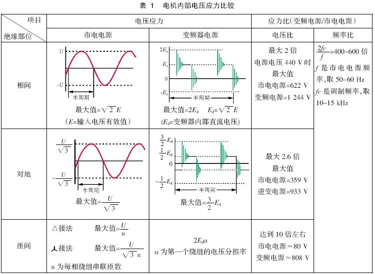 電機內(nèi)部的斷面如圖7 所示。電機有定子和轉(zhuǎn)子,定子內(nèi)有安放三相線圈的槽。如果放大槽的內(nèi)部,可以看到有許多的線圈(漆包線),各線圈對地之間、各相之間、線匝相互之間都有絕緣存在。通常對地、相間都有絕緣紙插入,而線匝之間沒有絕緣紙插入,它利用堅固的漆包線的漆層獲得絕緣。微浪涌電壓給這些絕緣全部帶來影響,這些絕緣損壞之中,線圈匝間損壞最多。表1 列出了有關(guān)電機內(nèi)部各絕緣部分承受的電壓值,也稱為電壓應(yīng)力,提供了用市電電源驅(qū)動電機和用變頻器驅(qū)動時相比較的資料。