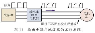 輸出濾波器的工作原理如圖11所示。微浪涌電壓是變頻器輸出脈沖上升時間出現(xiàn)的dv/dt 過大所引起,又由于阻抗不匹配被反射而發(fā)生。因此輸出電路使用濾波器,用于抑制dv/dt,也就是抑制了高頻成分因阻抗不匹配而造成的微浪涌。所以輸出濾波器是dv/dt抑制型濾器,這種濾波器在變頻器的調(diào)制頻率為15 kHz、接線長度為400 m時,能做出微浪涌電壓1 000 V以下的性能非常優(yōu)良的產(chǎn)品。不過,這種方式的濾波器為了讓逆變器的輸出電流通過電抗器,不得不做成大容量,造成濾波器的大型化、高價格化、大重量,有的達到50 kg以上,給用戶造成了實際負(fù)擔(dān)。