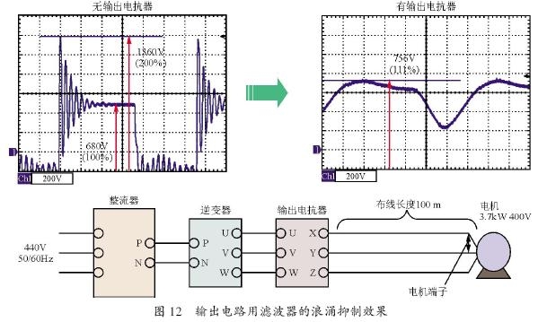 圖12 顯示了供電電源440 V,功率為3.7 kW的變頻器供電給電機(3.7 kW,400 V),在接線長度為100 m時、測量電機接線端子U-V 之間的微浪涌電壓的抑制效果。在沒有輸出濾波器的情況下,微浪涌電壓達到1 360 V,相當(dāng)于變頻器內(nèi)部直流電壓680V 的200%。有輸出濾波器的時候,頂峰值電壓是756 V、相當(dāng)于變頻器器內(nèi)部的直流電壓680 V的111%,它和沒有輸出濾波器的頂峰電壓差距有604 V,抑制效果達89%。