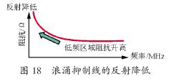 浪涌抑制線的反射降低:浪涌電流的高頻分量在浪涌抑制線內(nèi)被旁路和衰減,使浪涌形狀變鈍,浪涌頻帶中心向低頻方向移動。又從浪涌電流來看,好像浪涌抑制線的特性阻抗逐漸變高了,使得抑制線末端不易被反射回來。如圖18所示。