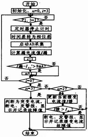 漏電流檢測的流程圖如圖3所示。漏電流信號過零點后,開始AD采樣轉換,根據(jù)定時器測得漏電流和工作電壓之間的時間差計算相位差,得到漏電流的大小,將連續(xù)3個周期同一時刻的值分別與突變電流和緩變電流的設定值作比較,判斷當前是否發(fā)生漏電;若漏電,漏電由緩變電流引起還是突變電流引起;若大于整定值則立刻斷電并顯示系統(tǒng)當前故障值并報警等。