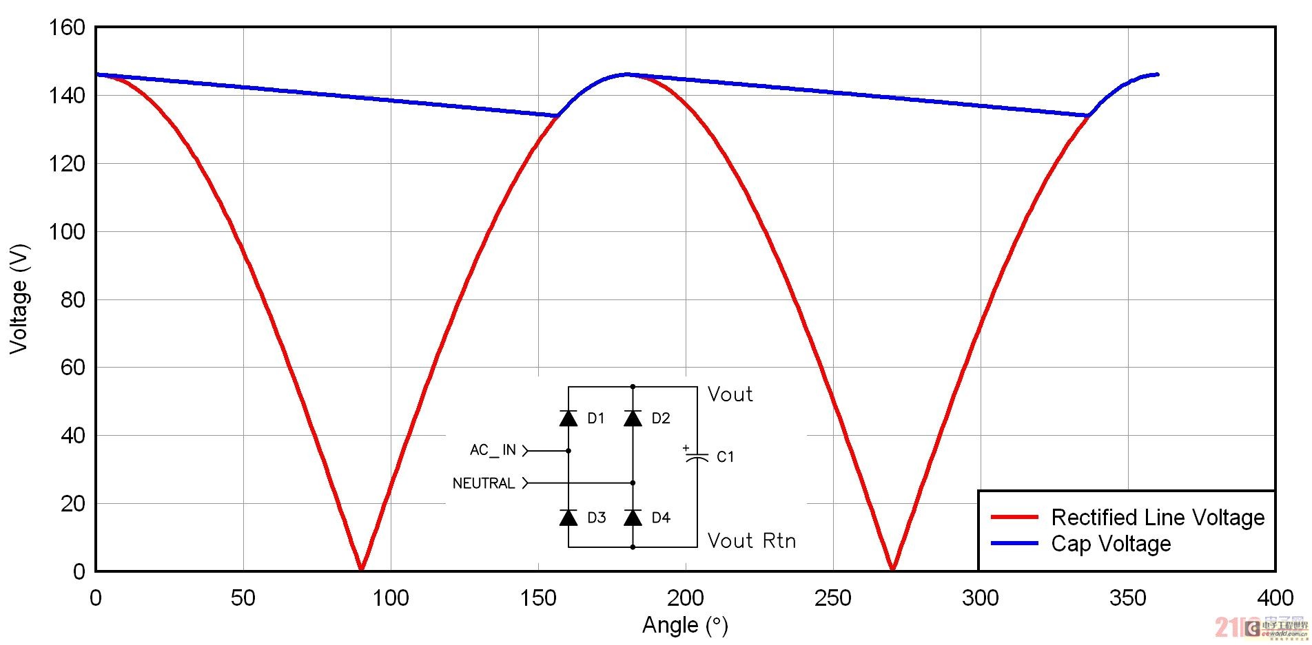 圖 1 和圖 2 顯示了離線電源中使用的兩種整流器配置結(jié)構(gòu)。圖 1 為一個全波橋接,其中,AC 輸入電壓經(jīng)過簡單整流以后便被送至電容。這種電路常見于寬范圍 AC 和 230 伏 AC 應(yīng)用中。電容充電至正弦波峰值,然后在大部分半周期放電。電容紋波電流包括兩個部分:首先是充電周期,其電流由電容值和所應(yīng)用的 dV/dt 決定;其次是電容放電。電源起到恒定電源負(fù)載的作用,因此電容以非線性速率實施放電,其計算方法為:W = ½ * C *V^2 = P * dt。