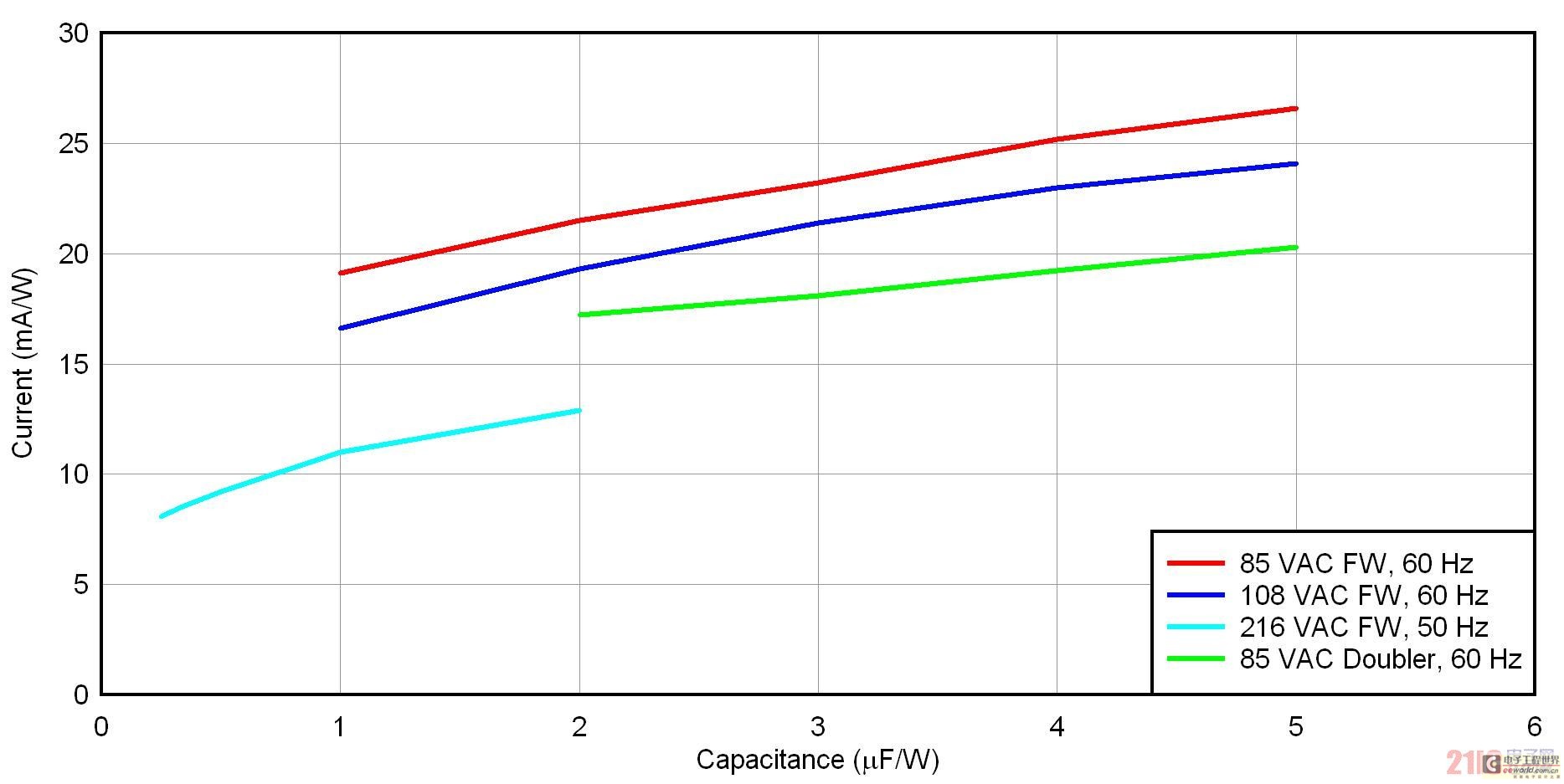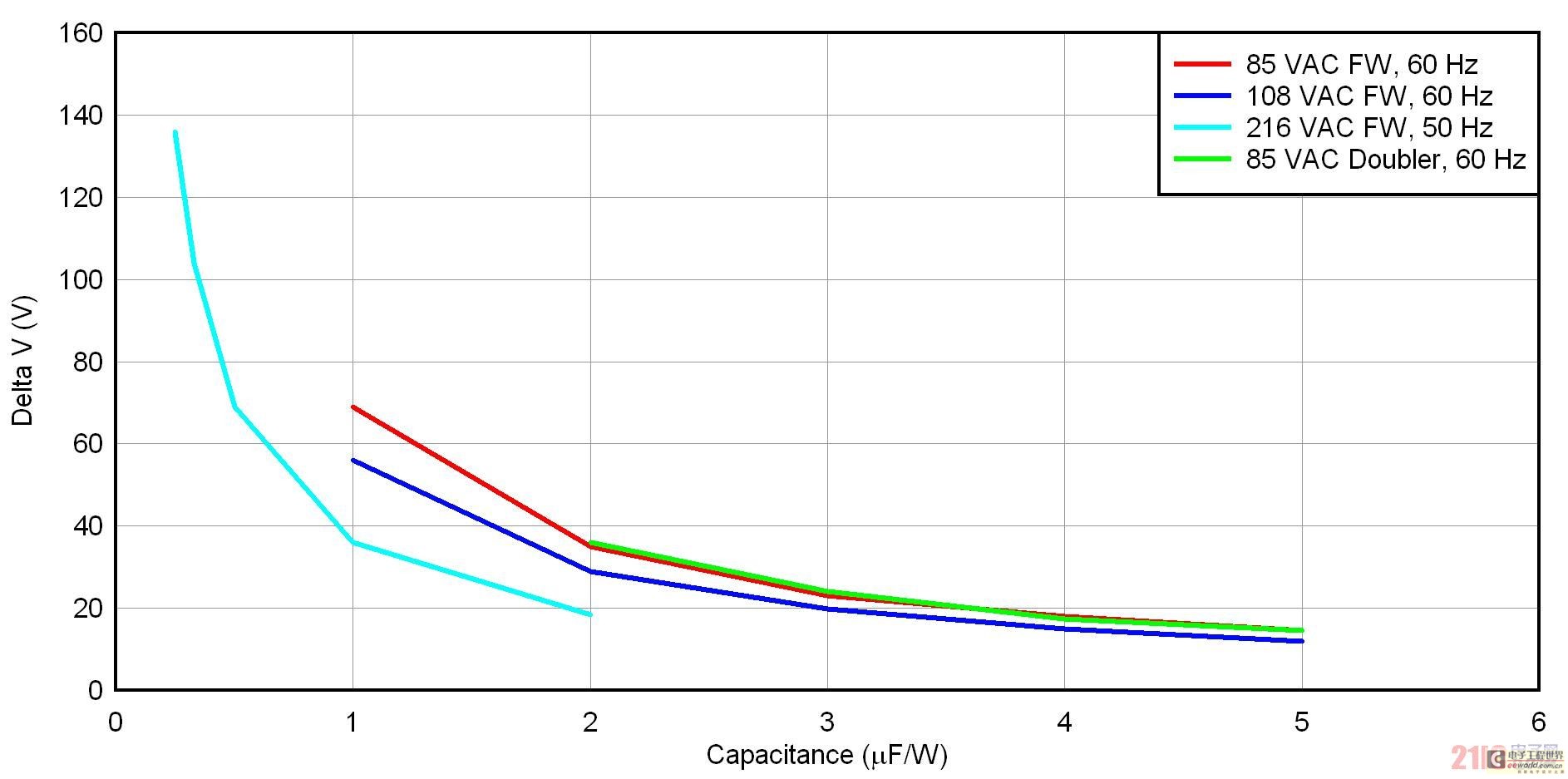 [page]圖 3 顯示了四種整流器/輸入電壓方法的 uF/W 標(biāo)準(zhǔn)化壓降。共有三種全波橋接方法,適用于低線壓美國(108 VAC/60 Hz)、低線壓日本(85 VAC/50 Hz)和低線壓歐洲(216 VAC/50 Hz)。另外,還有一個低線壓日本的倍壓器。就全波橋而言,標(biāo)準(zhǔn)化過程只需將電容除以功率。在倍壓器中,標(biāo)準(zhǔn)化方法是將兩個串聯(lián)電容之一的電容除以功率。要想使用該曲線圖,請首先確定您的整流器配置結(jié)構(gòu),并選擇一個可以接受的壓降。之后,您只需讀取輸入電容的 uF/W 便可。最后,通過乘以您的功率,便可去標(biāo)準(zhǔn)化。