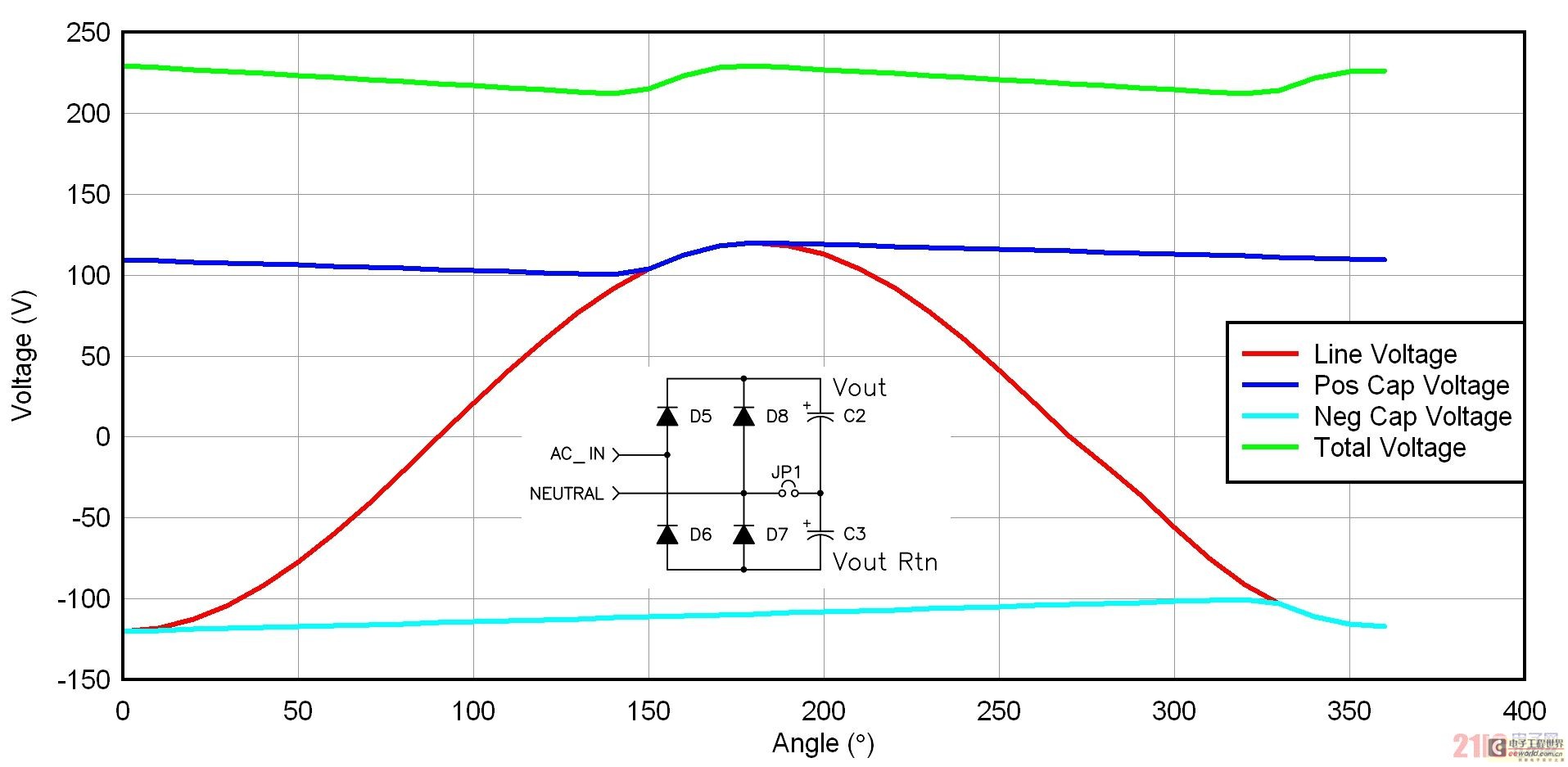 圖 2 描述了一種倍壓器整流配置結(jié)構(gòu),許多 115/230 VAC 應(yīng)用都使用了這種結(jié)構(gòu)。如果您有一個 230 VAC 應(yīng)用,則您的輸入級需要處理最大輸入電壓(265 VAC)乘以峰值因數(shù)這么大的電壓,其接近 400 伏。在與一個 115 VAC 輸入一起使用時,倍壓器將經(jīng)過整流的電壓,增壓至接近 230 VAC 輸入電平。我們可以專為 230 VAC 線壓設(shè)計一個電源,以此來減小電源工作的整流后電壓范圍。我們通常使用一個跳線或者開關(guān),來實現(xiàn)不同整流器配置之間的切換。這種方法的唯一缺點是偶爾出現(xiàn)人為倍增 230 VAC 輸入的情況,從而對電源造成嚴(yán)重破壞。圖 2 顯示了倍壓器電路的一些波形。電容之間不帶電。兩個整流器交替對每個電容施加輸入電壓。一個周期中,每個電容都被充電至峰值線壓,這樣它們每個都有一個線頻率紋波部分。由于電容為異相位充電,因此其和的紋波頻率為線頻率的兩倍。