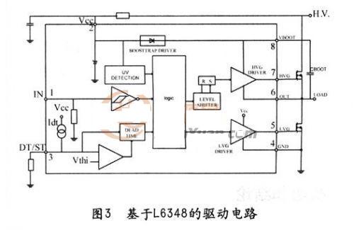 ST公司的L6384是專門(mén)的不對(duì)稱半橋驅(qū)動(dòng)芯片,其原理圖及外圍電路如圖3所示。單脈沖從1腳(IN)輸入,5腳(HVG)和7腳(LVG)輸出互補(bǔ)的脈沖。3腳(DT/ST)外接電阻和電容來(lái)控制兩路輸出的死區(qū)時(shí)間。當(dāng)3腳的電平低于0.5V的時(shí)候,芯片停止工作。專用芯片具有外圍電路簡(jiǎn)單、占用空間小的特點(diǎn),但由于其成本較高,不適用于低成本設(shè)計(jì)的產(chǎn)品