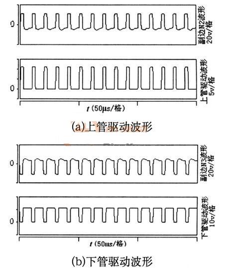 在SABER仿真下,該變壓器副邊N2,N3以及上、下管的驅(qū)動(dòng)波形分別如圖5(a)、(b)所示。